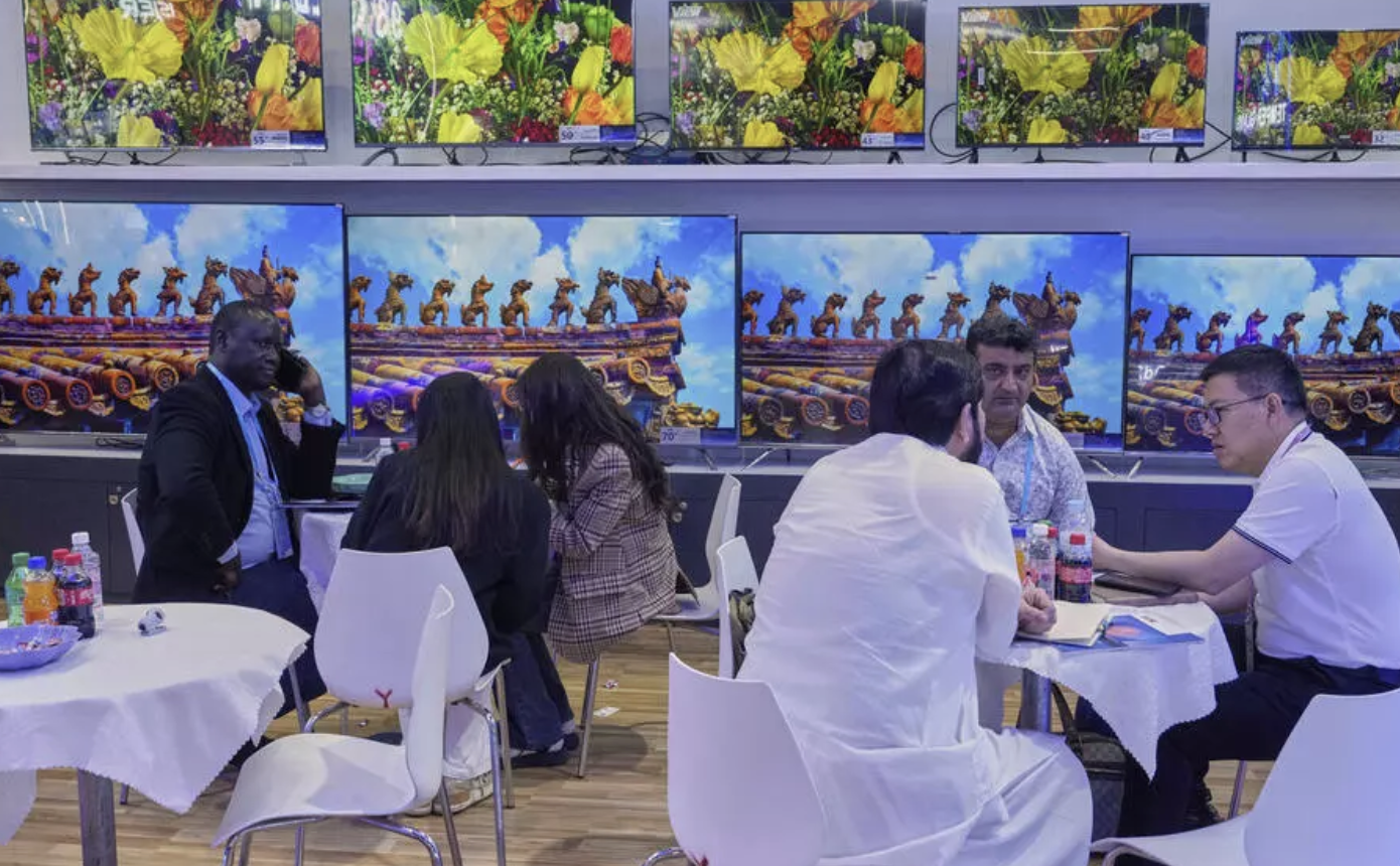 2025年4月,在位于中国南方广东省广州市的第137届广交会上,参观者与电视机销售代表交谈。 © 美联社图片