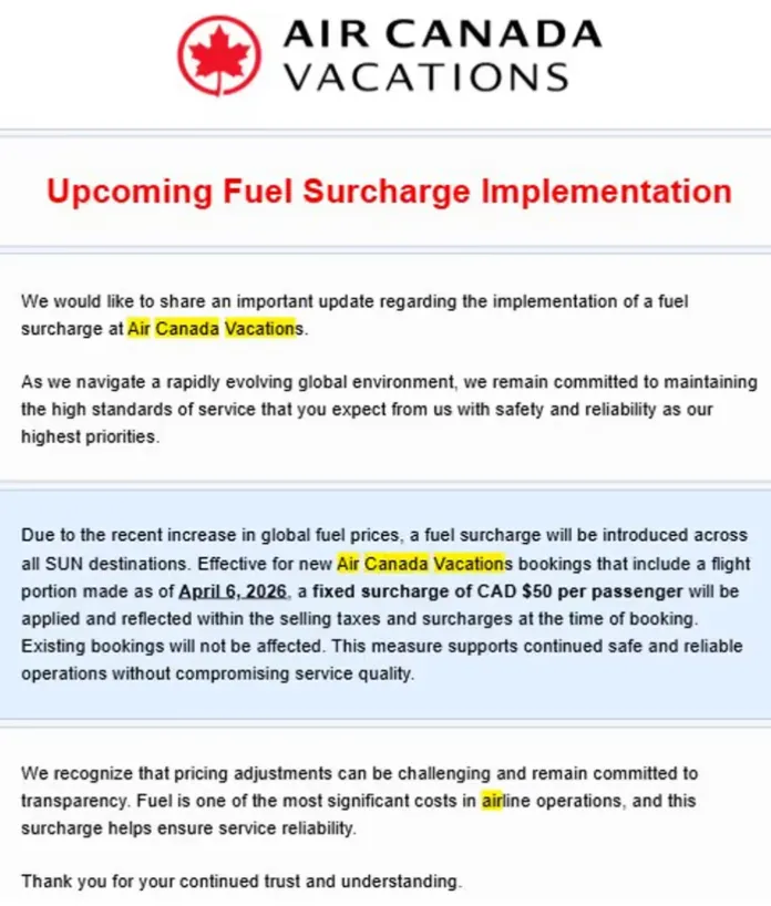 这家隶属于Air Canada的旅游子公司已经通知旅行代理:从4月6日起,新预订且包含机票的度假套餐,每位乘客将收取固定50加元的附加费。这笔费用会在预订时体现在税费和附加费中。