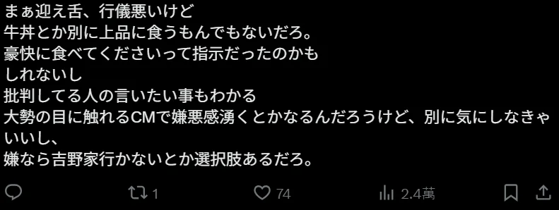 “伸出舌头吃饭”确实不太礼貌,但牛丼这种东西,本来也不是讲究优雅地吃的吧。