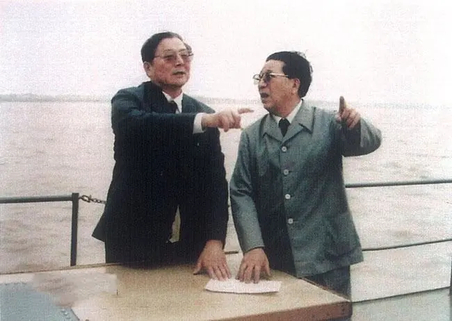 (1989年,向守志和老军长秦基伟一起在长江上回顾当年的渡江战役)