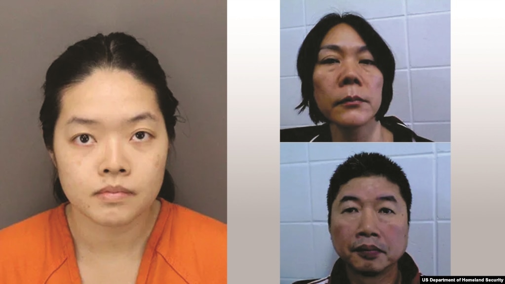 美国国土安全部2026年4月3日的新闻稿提供的与麦克迪尔空军基地爆炸装置案有关的嫌疑人安·玛丽·郑(音译,左)及其父母邹秋琴(音译,右上)和郑家章(音译,右下)的照片。当局表示,邹与郑是来自中国的非法移民,已被移民和海关执法局羁押。