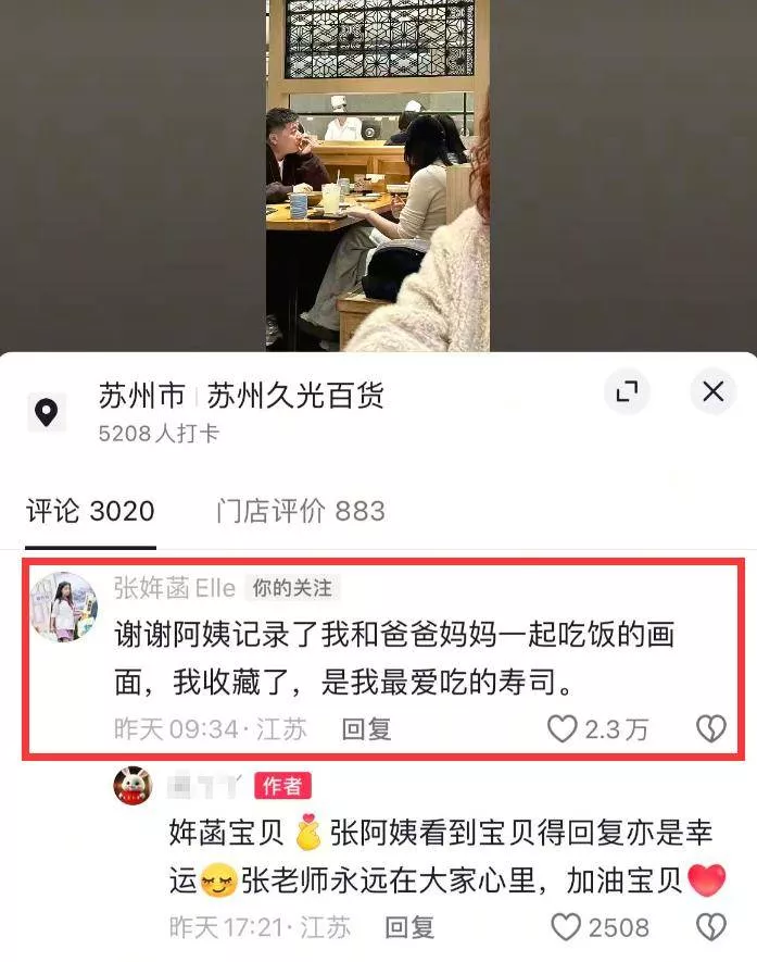 张雪峰的女儿张姩菡评论了这条动态,懂事乖巧的张姩菡先是对拍摄照片的博主致谢,还表示自己会收藏这张照片,当天他们吃的是自己最喜欢的寿司。