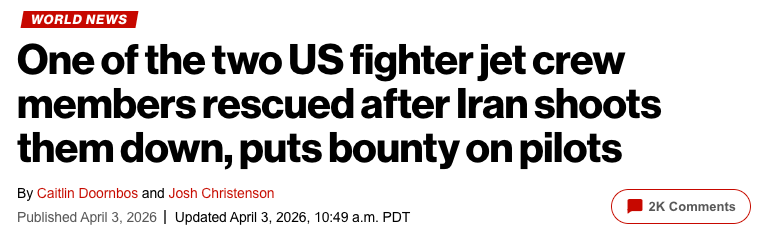 伊朗国营电视台呼吁民众抓捕被击落的“敌方”飞行员,并承诺给予奖励。美联社报道该电视主播称:“抓到敌方飞行员并交给警方,将获得珍贵奖赏。”这是本轮冲突中,国营媒体首次公开煽动民众抓捕美军飞行员。