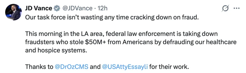 这个行动由副总统JD Vance领导,FBI、美国司法部、美国卫生与公众服务部监察长办公室 (HHS-OIG)等共同协作,专门打击通过开设“虚假临终关怀机构”来骗取联邦医疗保险(Medicare)资金的犯罪网络。