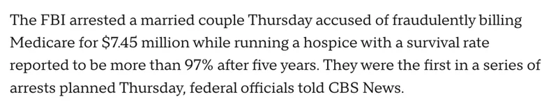 截至目前,共有15名被告面临联邦指控,涉嫌合谋欺诈美国医疗保健系统,诈骗金额近6,000万美元——其手段包括经营“幽灵”临终关怀(Hospice Care,或称安宁疗护)机构,将并非身患绝症的人员登记为受益人、虚报账单,从而骗取联邦医疗保险(Medicare)资金。