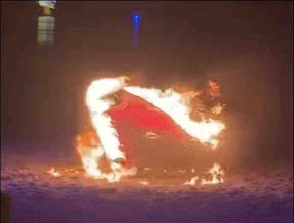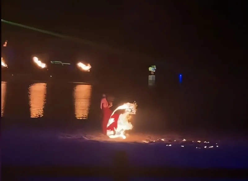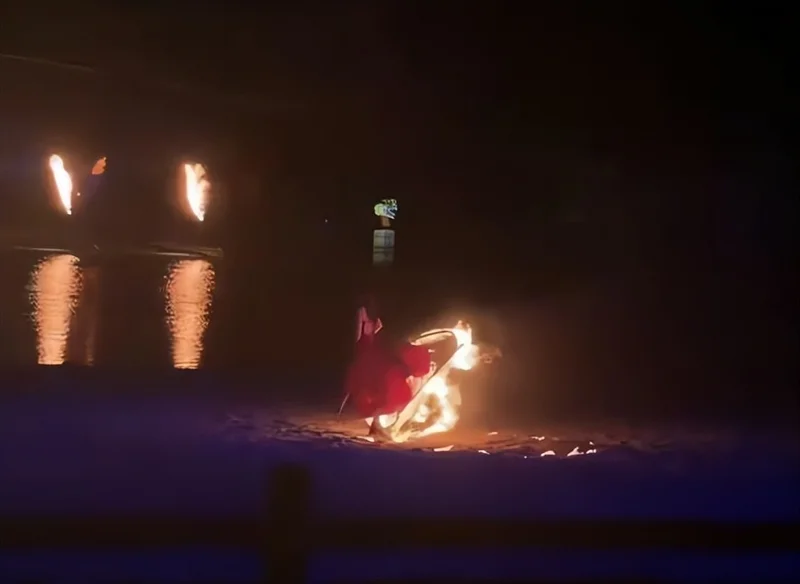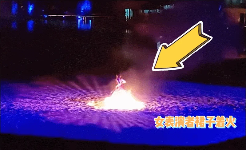 火苗猛地顺着裙摆向上窜,瞬间从下沿烧到了腰部以上,女演员后背火势渐大。她当即提起燃烧的裙子,背对观众,尖叫着向场地后方的水池狂奔。整个过程持续了约11秒,最终她一跃跳进水池,身上的火才被彻底浇灭。拍摄视频的游客称,事发在下午六七点钟,随后看到有工作人员上前搀扶。