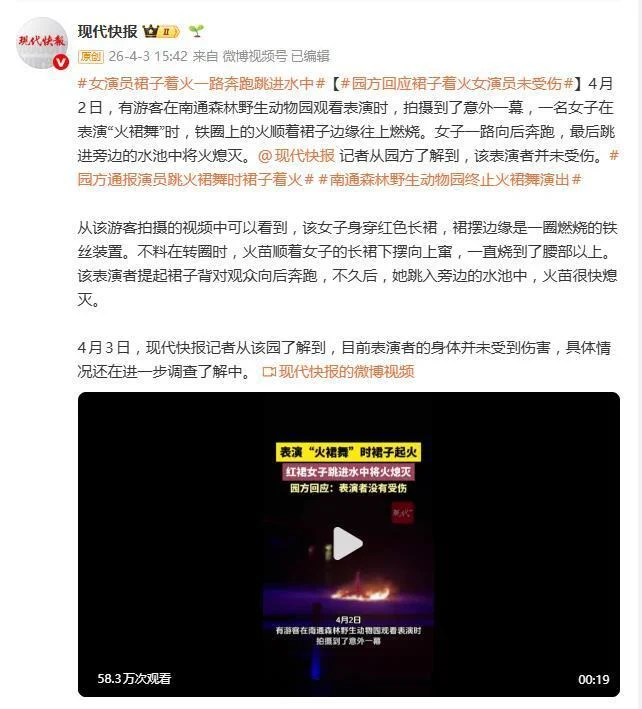 据4月3日报道,这惊险一幕,直接把“表演事故”的词条炸上了热搜。4月2日,江苏南通森林野生动物园里,一场名为“天马浴河”的表演差点成了“火人逃生”现场,看得游客心惊肉跳。