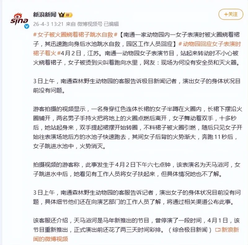 面对舆论关切,园方在4月3日给出了回应。南通森林野生动物园的客服向记者确认,演出女子的身体状况目前没有问题。对于事故的具体原因和细节,他们表示还在向演艺部门进一步了解,并将通过相关渠道公布。