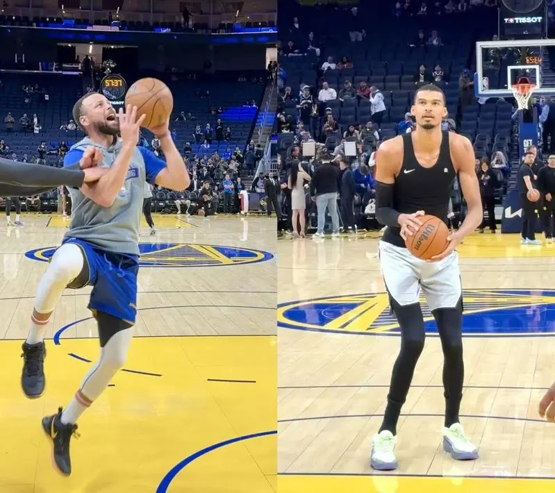 赛前柯瑞(左)恢复高强度热身,并传出最快在周日对阵火箭的比赛中复出;身高7呎4的温班亚马(右)在对阵勇士的比赛中拿下41分的高分。(记者王子涵╱摄影)