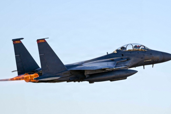 2026年3月16日,在“史诗之怒”(Operation Epic Fury)行动期间,一架美国空军F-15E打击鹰(F-15E Strike Eagle)从秘密地点起飞执行战斗任务。(美国空军/法新社)