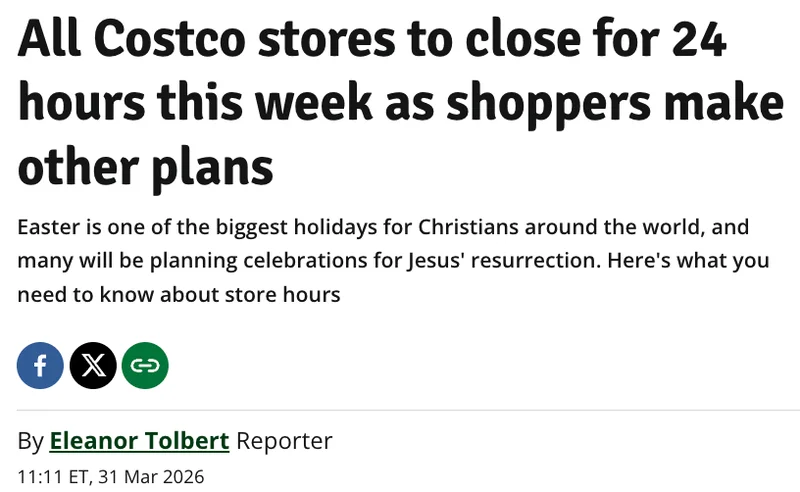 根据安排,Costco全美门店将在复活节当天暂停营业,Target也将关闭所有门店。消费者若有购物需求,建议提前计划好时间。