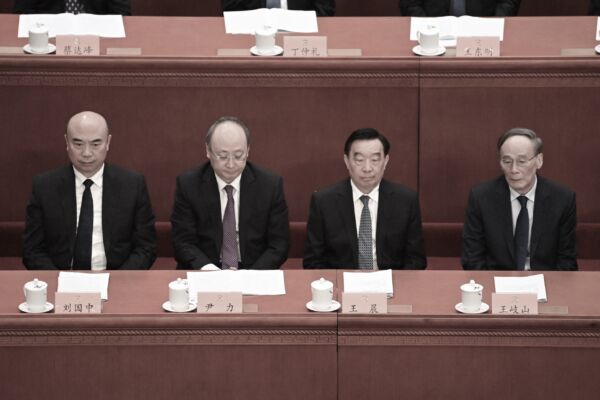 2023年3月4日,中共中央政治局委员刘国中(左一)、北京市委书记尹力(左二)、中共全国人大副委员长王晨(右二)和中共国家副主席王岐山(右一)在北京大会堂出席中国人民政治协商会议开幕式。(NOEL CELIS/AFP via Getty Images)