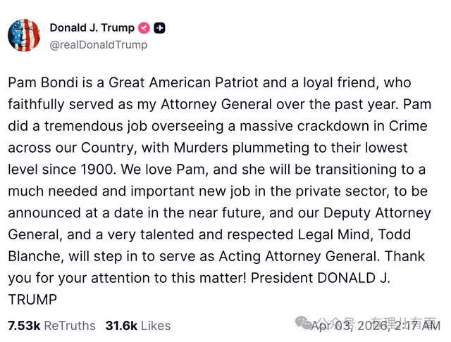 当地时间4月2日中午,美国总统特朗普在社交平台突然发帖,宣布解除司法部长帕姆·邦迪的职务,帖子里还温情脉脉地称她是“伟大的爱国者”“忠诚的朋友”。