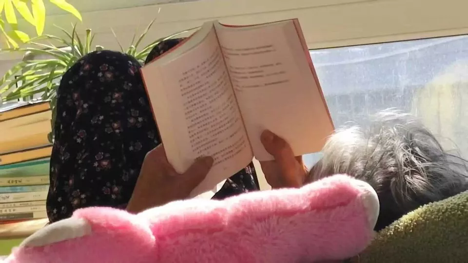 茸茸姥姥柳树梅在看书