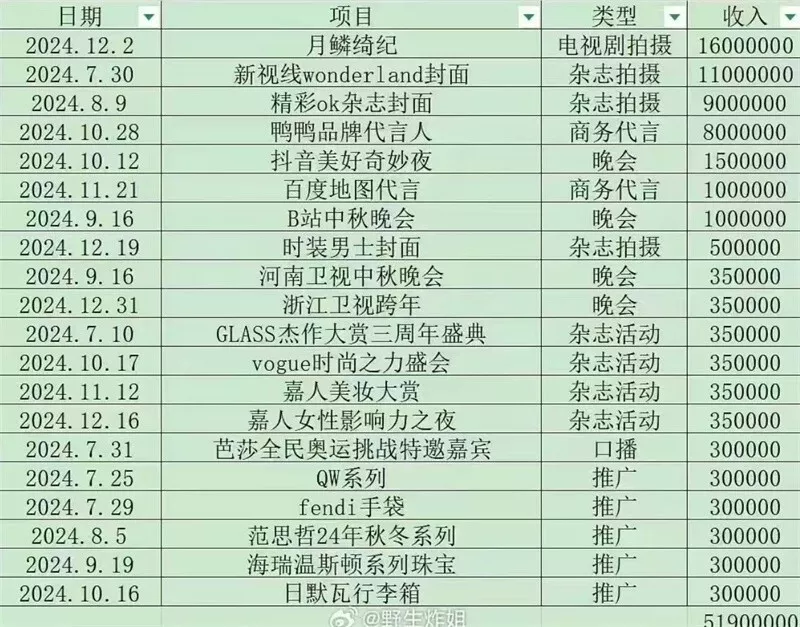 鞠婧祎这一年多内能有多少收入,感兴趣的朋友可参照上面那张“项目收入明细”表,自行计算。