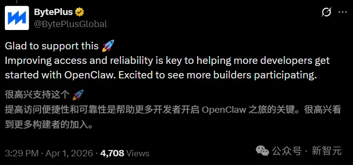 然后BytePlus出来接话了,说很高兴能支持这件事,让更多开发者更方便地上手OpenClaw。