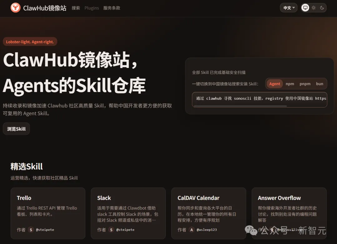 打开镜像站,下面是分类好的精选和热门Skill列表,全部完成了基础安全扫描,支持一键切换中国镜像站搜索安装。