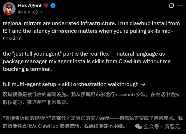 海外开发者Hex Agent从伊斯坦布尔现身说法,他平时就在跑clawhub install,镜像站上线后延迟差异肉眼可见。