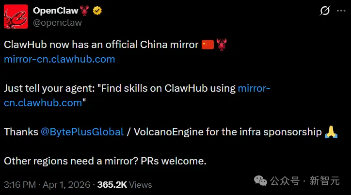OpenClaw官方刚刚在X上官宣,ClawHub中国镜像站正式上线,地址mirror-cn.clawhub.com。