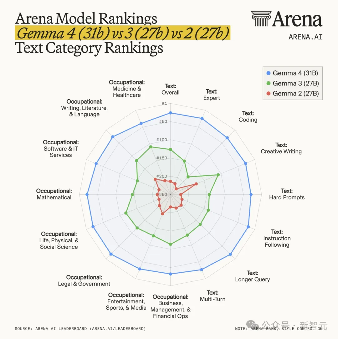 最炸的一个数字,31B Dense在Arena AI文本榜单上拿下开源第三,Elo评分1452。