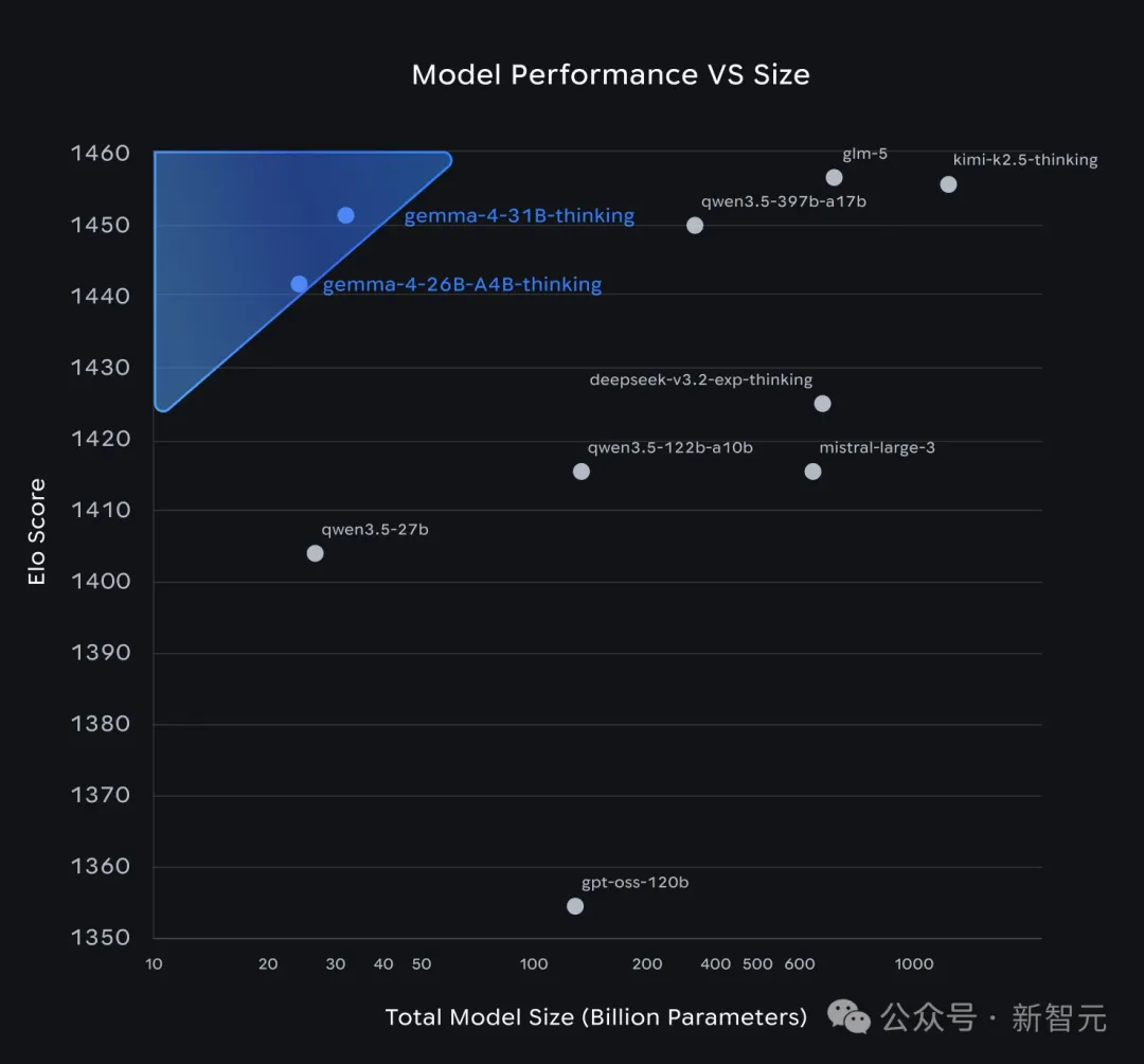 26B MoE更离谱:260亿参数,推理时只激活38亿,Elo打到1441,排开源第六。