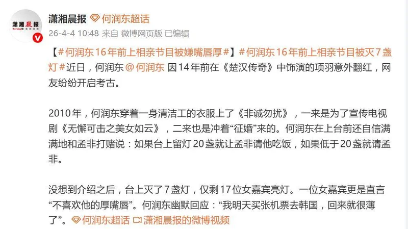 近日,何润东因14年前在《楚汉传奇》中饰演的“项羽”意外翻红,其粗粝硬朗的战场形象被赞为“武将天花板”。网友回溯其演艺生涯时,这段“相亲被拒”的旧事因与现实反差强烈引发热议,2010年因造型、厚嘴唇遭女嘉宾淘汰;2026年因阳刚气质和敬业精神成为“审美回归”标杆。
