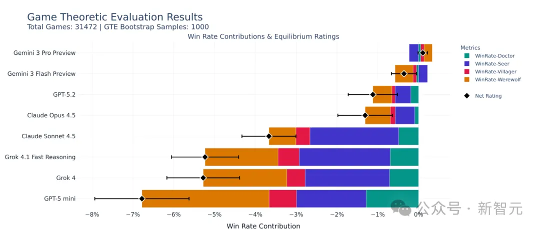 Kaggle Werewolf Game Theoretic Evaluation Results(31,472场对局,polarix库评估)。Gemini 3 Pro Preview净评级最高,狼人角色贡献显著领先,展现社交欺骗优势。