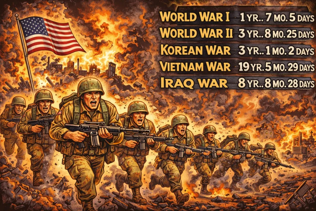 特朗普宣称,“我们要正确看待这场冲突”,然后列举了美国历史上经历的战争时长:一战持续了1年7个月零5天,二战持续了3年8个月零25天,朝鲜战争持续了3年1个月零2天,越战持续了19年5个月零29天,伊拉克战争持续了8年8个月零28天。