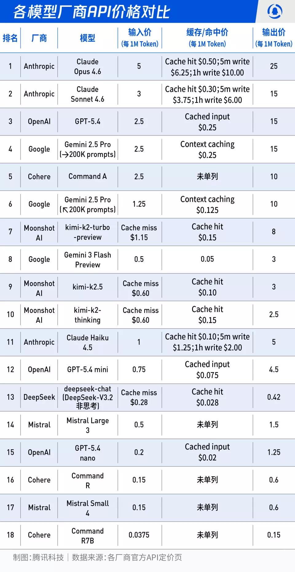 GPT-5.4是OpenAI截至3月的最新旗舰,输入价$2.50;Opus 4.6在多项评测上表现优于GPT-5.4,输入价却是$5.00,贵了一倍。而DeepSeekV3.2输入价仅$0.28,不到Opus 4.6的十八分之一,但在许多通用任务中表现可用。同一个月在售的模型之间,定价可以差两个数量级。