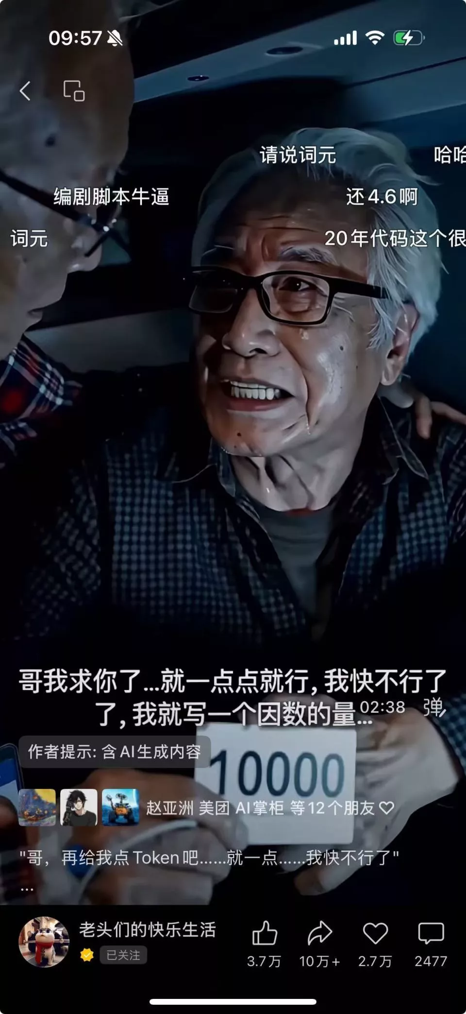 刚刚过去的3月,视频号上一条短视频在程序员圈子爆火,一个白发“程序员老头”对着另一个苦苦哀求,要的不是钱,是Token。3.7万点赞,10万转发。视频的主角是AI制作的,内容是虚构的,但是对token的成瘾反馈,是真的引起了情绪共鸣。