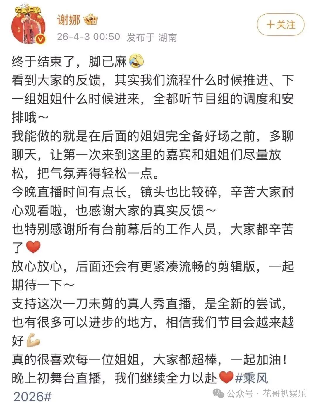 面对铺天盖地的吐槽,谢娜在第二天火速发文回应,试图撇清自己的责任。她表示节目所有的进度和流程,都是导演组通过齐思钧的耳返下达指令,自己只是被动等待流程安排,直播出现问题不该由她背锅,还声称自己为了活跃现场气氛,一直主动和姐姐们聊天互动,努力热场避免冷场。这边回应刚发出,相关热搜就紧跟着安排上,暗戳戳夸赞她在舞台上站了好几个小时,全程敬业又卖力,试图扭转舆论风向。