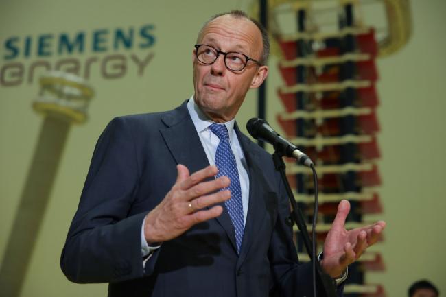 2026年2月26日,德国总理梅尔茨在参观西门子能源时对媒体发表讲话。(美联社)