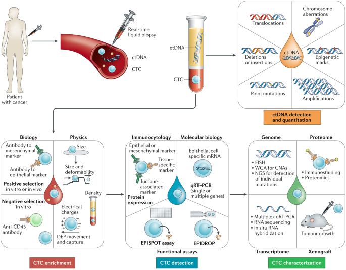 根据教科书上的解释,液体活检是指一种从血液等非实性生物组织中取样并分析,主要用于诊断或监测肿瘤疾病的方法。液体活检的主要检测指标,是血液中的循环肿瘤细胞(circulating tumor cells, CTC)和循环肿瘤DNA(circulating tumor DNA, ctDNA)。因为CTC和ctDNA直接与肿瘤有关系,因此我们可以通过血液取样,利用细胞分离和测序技术,使用液体活检技术来帮助医疗工作者估算CTC和ctDNA的数量,这样就能够显著提高肿瘤的预测精度和治疗的准确性。