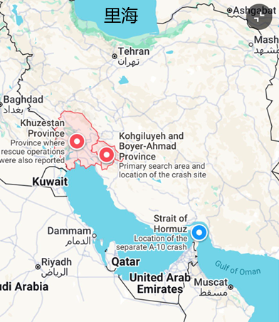 几十年前的弹射座椅不会和飞行员分离,而是和飞行员一起坠落。其下方有减震装备,免得飞行员摔坏。如今的座椅在弹射后会自动与飞行员分离,单独落地,所以伊朗人看到落地后的座椅,却不知道武器操作员降落在哪里,只知道在伊朗西南(下图)。图中上方是里海。俄乌战争时伊朗的无人机就是从里海的港口运到俄罗斯。里海是内海,只有五个沿岸国家(俄罗斯,伊朗,哈萨克斯坦、土库曼斯坦和阿塞拜疆)可以使用。俄乌战争中,伊朗的大批无人机和军火便是通过里海运到俄罗斯。如今伊朗有难,俄罗斯应该会通过里海向伊朗提供军火,但几天前以色列轰炸了里海港口。此事暂且按下不表。