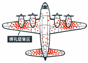 在第二次世界大战期间,美国军方面临一个严峻问题,即大量轰炸机在执行任务时被击落,无法返回基地。为了提高生存率,军方决定给飞机加装额外装甲,但装在哪儿才最有效呢?军方收集了所有成功返航的轰炸机,统计它们机身上的弹孔分布。结果显示机翼、机身后部、尾部等位置布满弹孔(见图),而其它地方则少有弹孔。