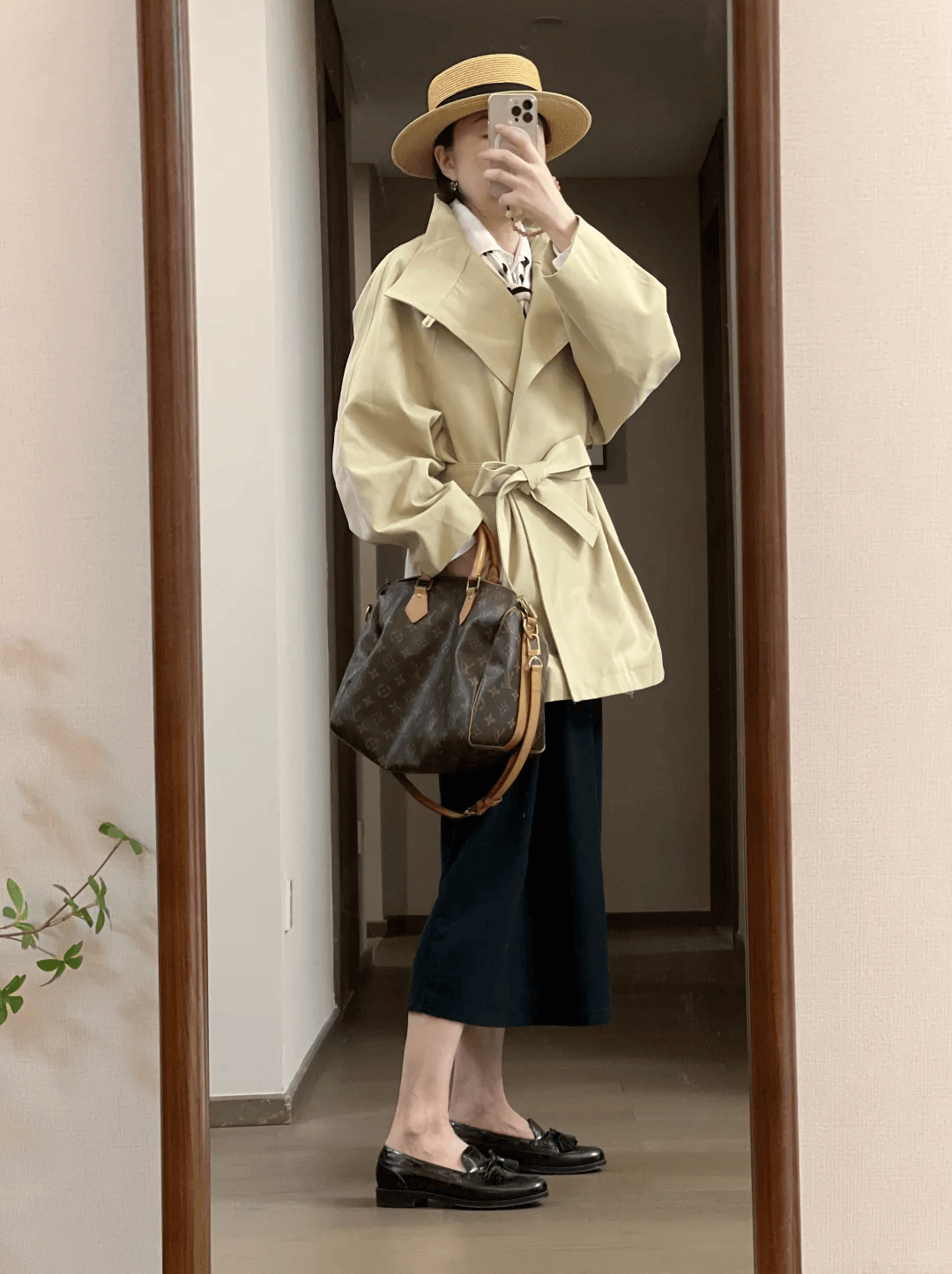 短款风衣最佳组合绝对是腰带,首先短款风衣长度的原因,不压个子,对小个子身材特别又好,其次,短款风衣刚好遮臀的长度,又能最大限度的隐藏身材缺点,遮肉显瘦的效果最佳,所以选择卡其色短款风衣与黑色裙子组合,再踩一双黑色乐福鞋,真的超级显瘦显身材,各种身材类型都能轻松驾驭哦!
