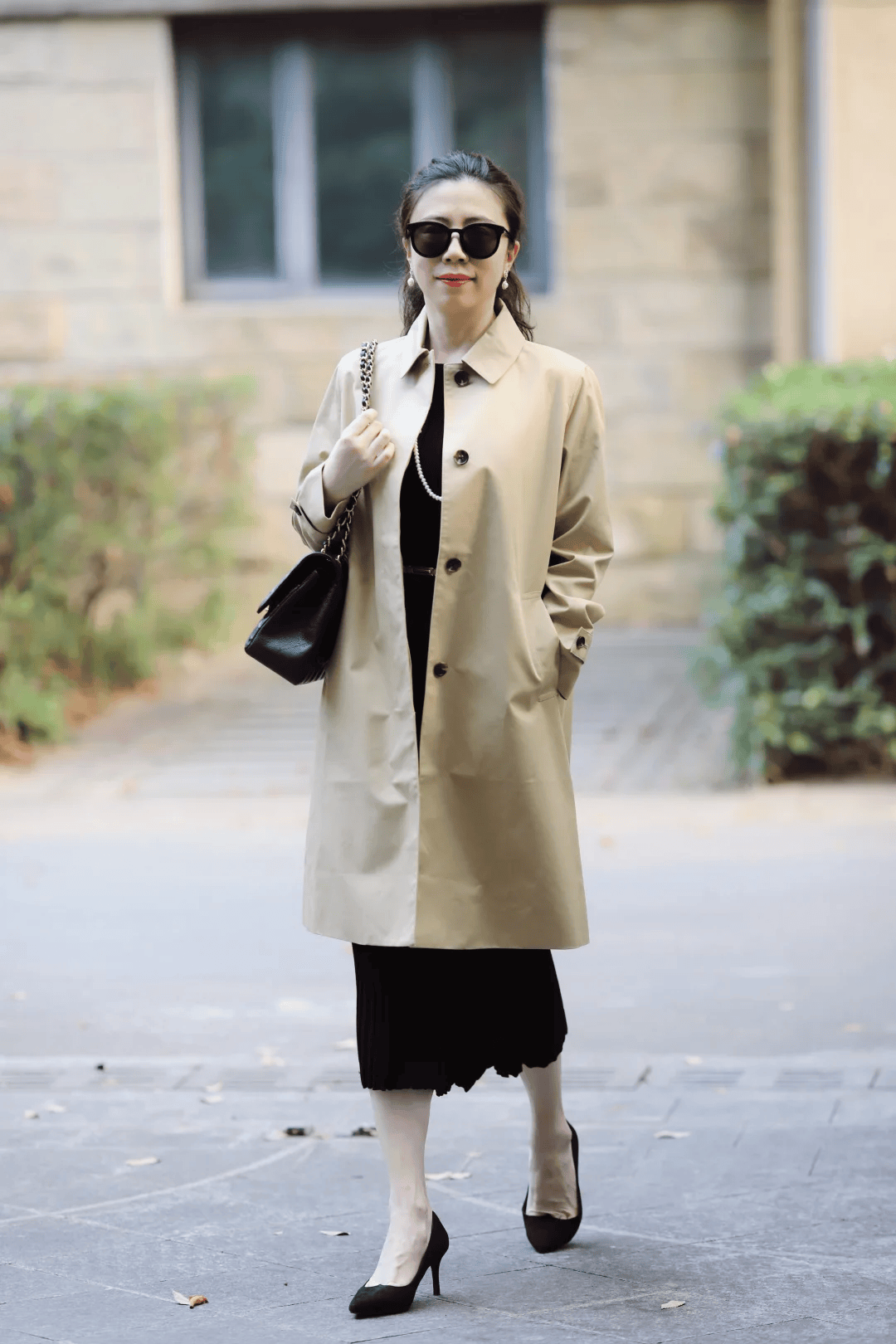 卡其色最为经典,也最百搭,博主用一件卡其色长款风衣与黑色连衣裙组合,就能轻松打造简约高级春日造型,这除了风衣版型选择的好,简约利落的H型风衣最百搭,其次色彩组合也恰到好处,黑色与卡其色都属于是经典的基础色,黑色链条包与尖头细高跟都选择了黑色,与连衣裙色彩呼应,珍珠项链点缀贵气。