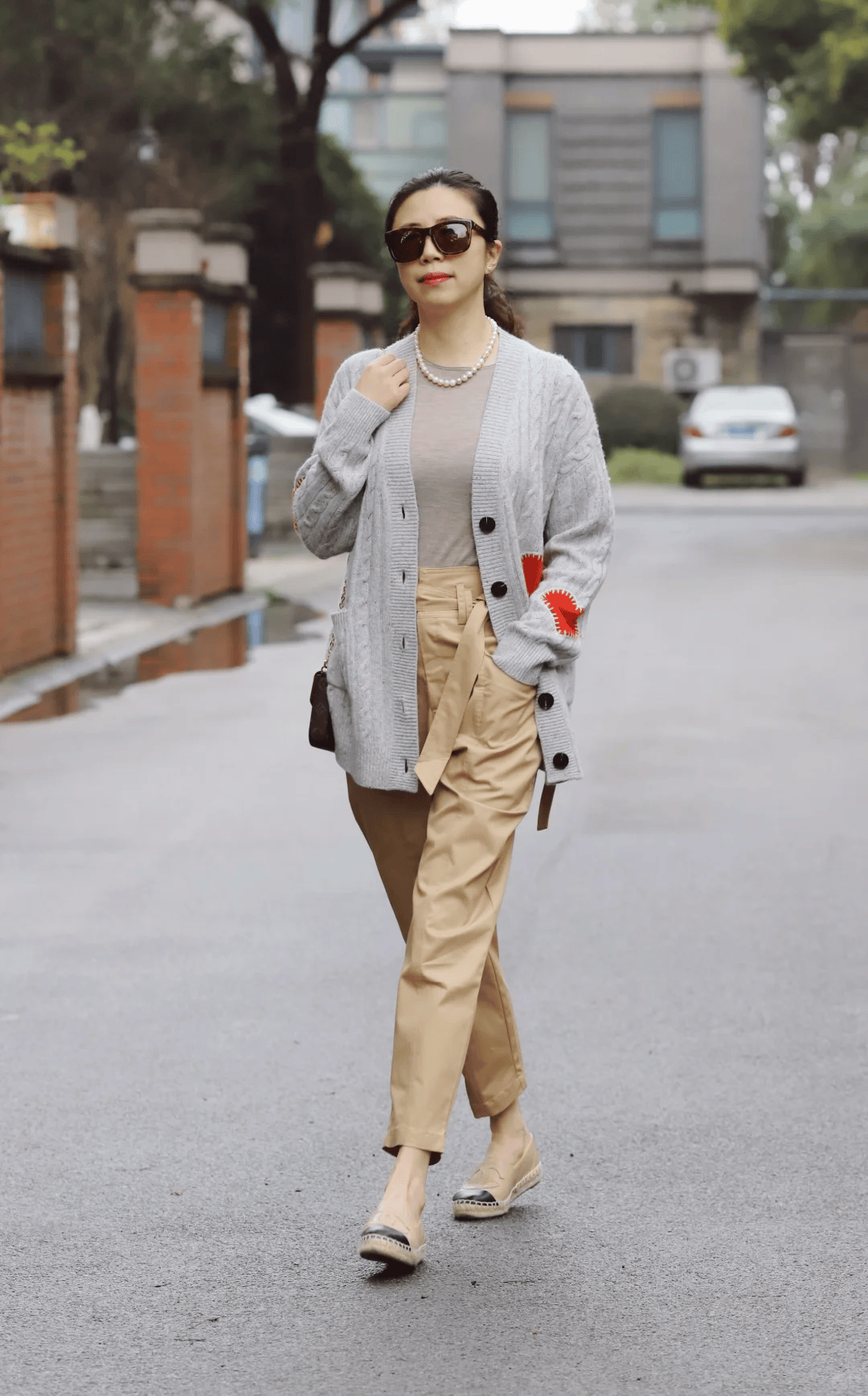 灰色针织开衫搭配同色系修身内搭,柔和又有层次,温柔不臃肿。下身选择高腰驼色锥形裤,利落显瘦、修饰腿型,高腰设计拉高腰线、显高显比例。整体配色高级协调,简约大气。