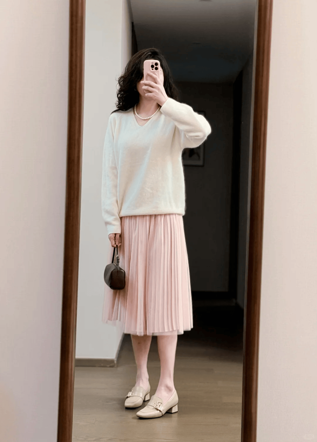 米色V领毛衣温柔显气质,V领修饰脸型更显利落。搭配淡粉色百褶裙,轻盈减龄不失优雅,柔和配色干净高级。脚踩卡其色乐福鞋,舒适百搭又提气场,整体清新温婉,大龄女性这么穿优雅减龄、温柔耐看。