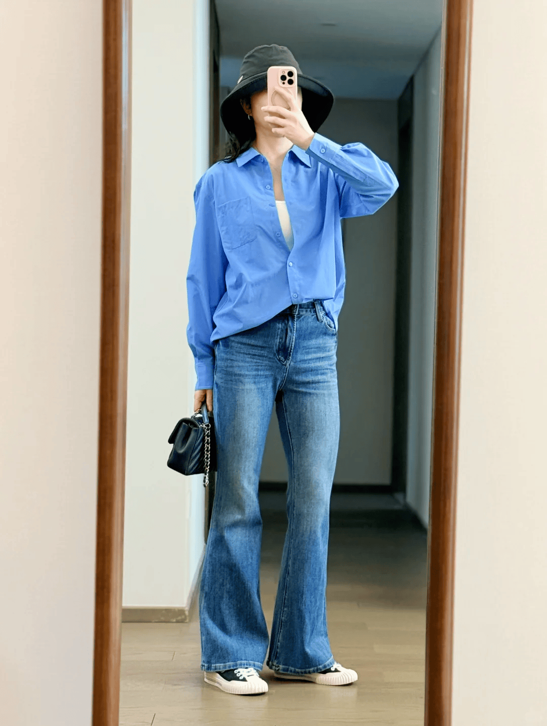 淡粉色针织开衫搭配白色 T 恤打底,清爽温柔又减龄。下身蓝色微喇牛仔裤修饰腿型,随性自在,配上舒适运动鞋,休闲又显活力。再搭米色帆布包,整体简约清新,54 岁穿轻松减龄、日常耐看,舒适又显气质。