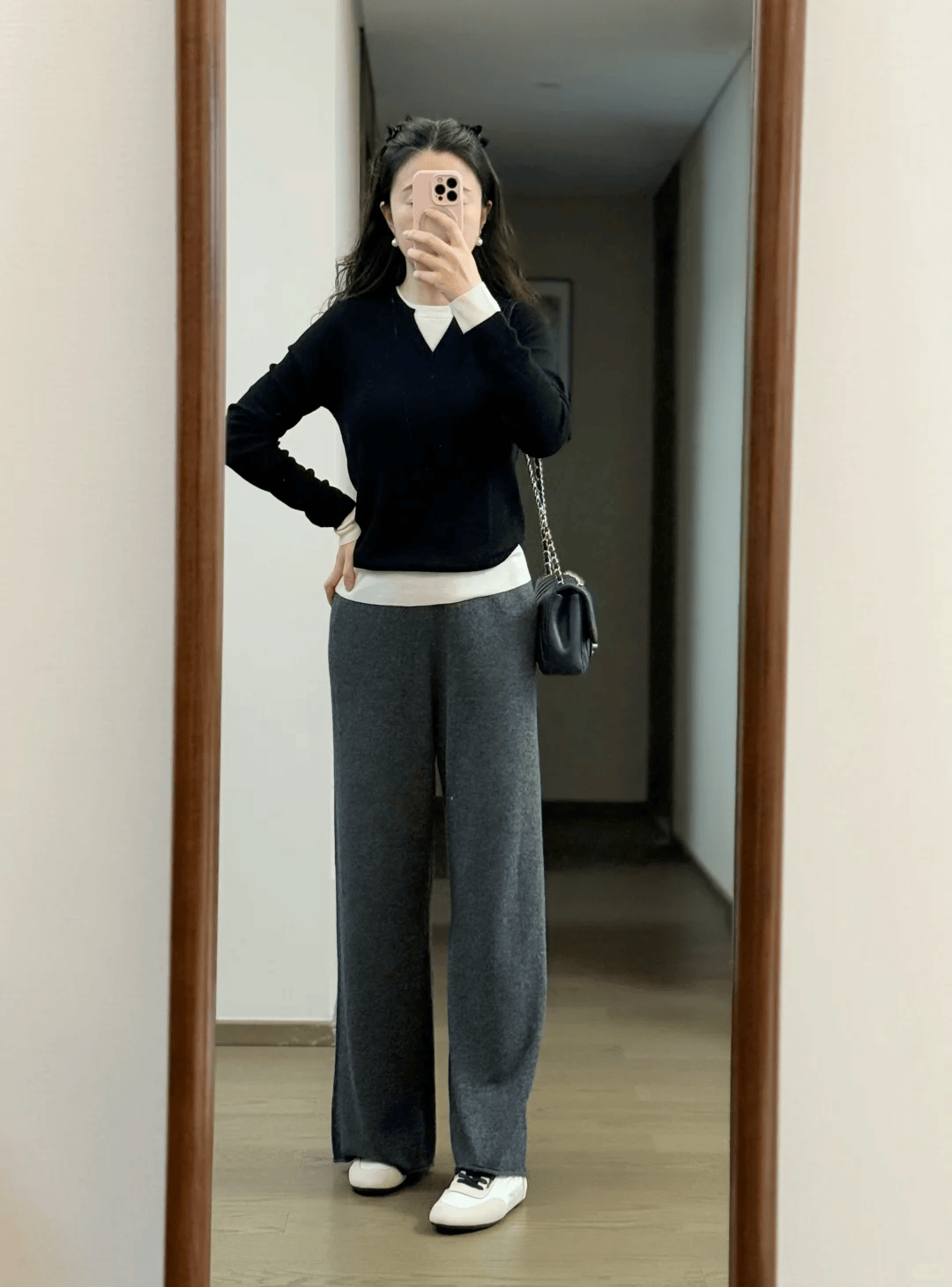 春季最适合的莫过于针织面料的阔腿裤了,博主这套黑白灰组合的运动风穿搭,将极简风诠释的淋漓尽致,黑色V领针织衫叠穿白色打底,下半身灰色窄版针织阔腿裤,叠穿可以让造型更有层次感,显得不那么单调,而且针织单品舒适感十足,很适合大龄女性的春季穿搭。