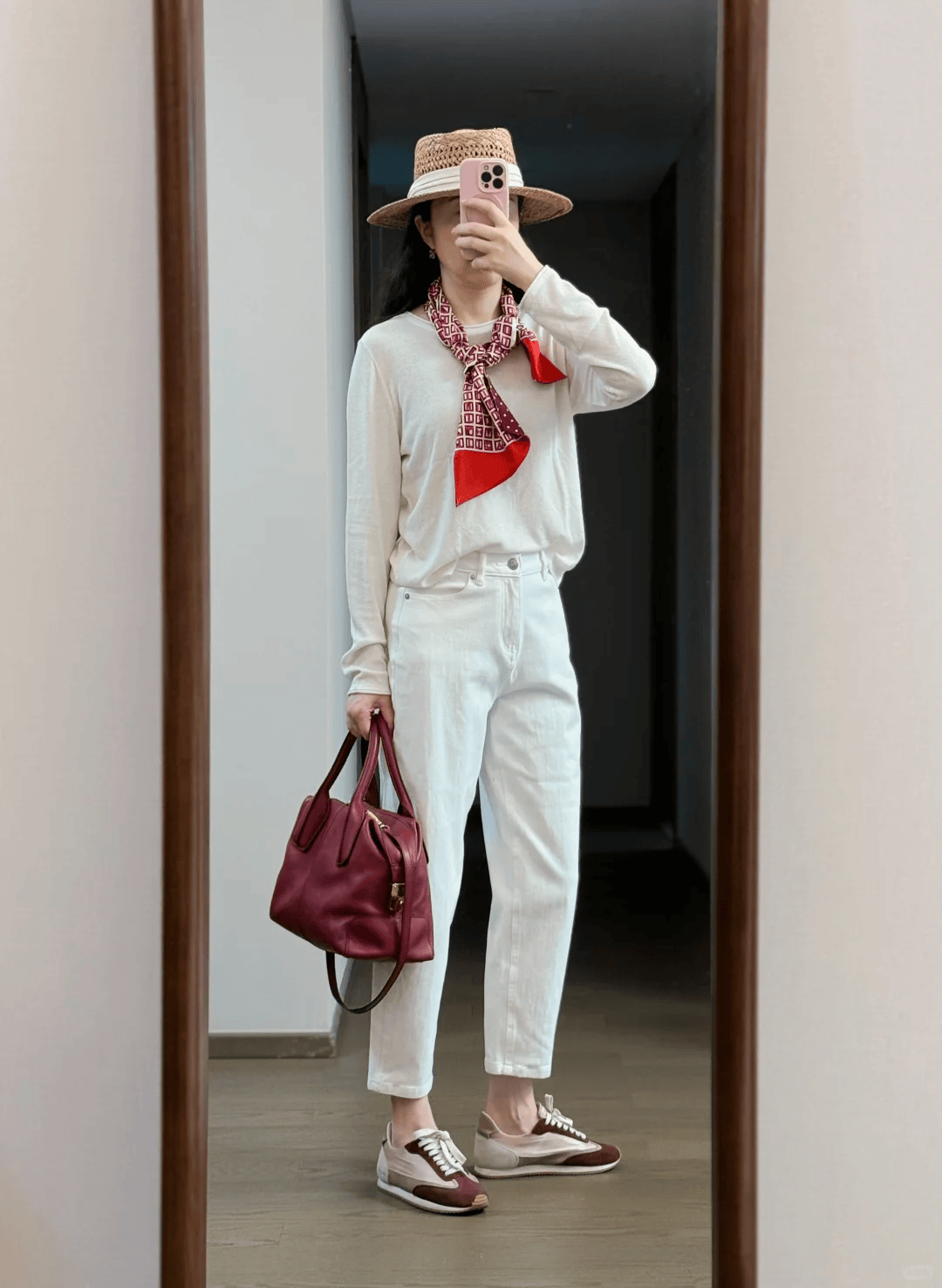 同色系搭配永远是最简约高级的,米白色针织衫+米白色锥形裤,简单又清新,博主选择了红色小碎花丝巾点缀,暗红色手提包加持,有时候配饰的点缀可以改变整体造型的气质,所以大家一定不要忽略了配饰哦!