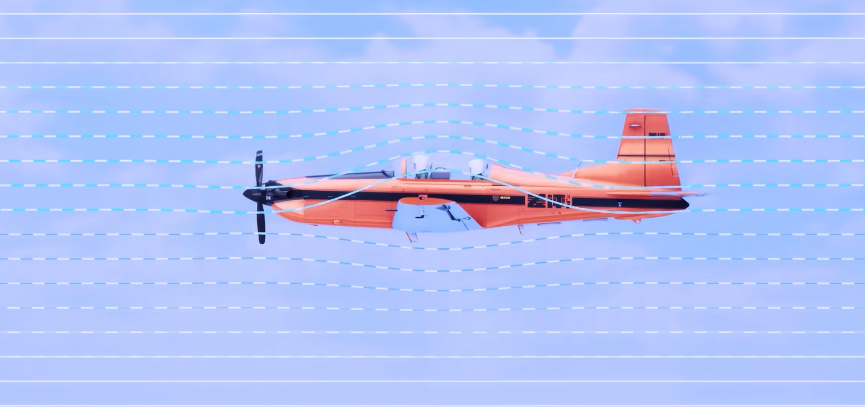 飞机向前飞的时候,机翼就会像一把铲子一样,“ 撞进 ” 空气里,把平行的气流切成两股,一部分从机翼上方过去,另一部分从机翼下方过去。