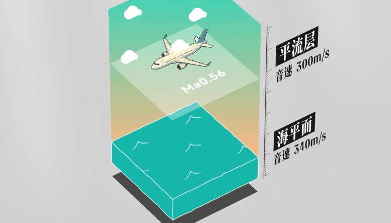 也就是说,一架 170m/s 的飞机,在海平面速度是 0.5 马赫,但如果以同样的速度飞上平流层,就变成 0.56 马赫了。