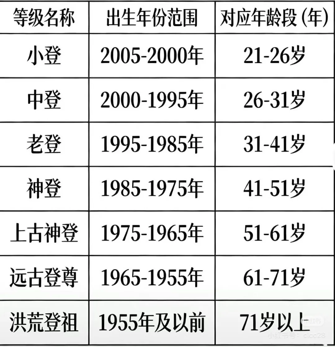 在网络上,流传着一份按照年龄段划分各类“登”的表格:生于2000—2005年,小登;生于1995—1999年,中登;生于1985—1994年,老登;生于1975—1984年,神登;生于1965—1974年,上古神登;生于1955—1964年,远古登尊;生于1955年之前,洪荒登祖。