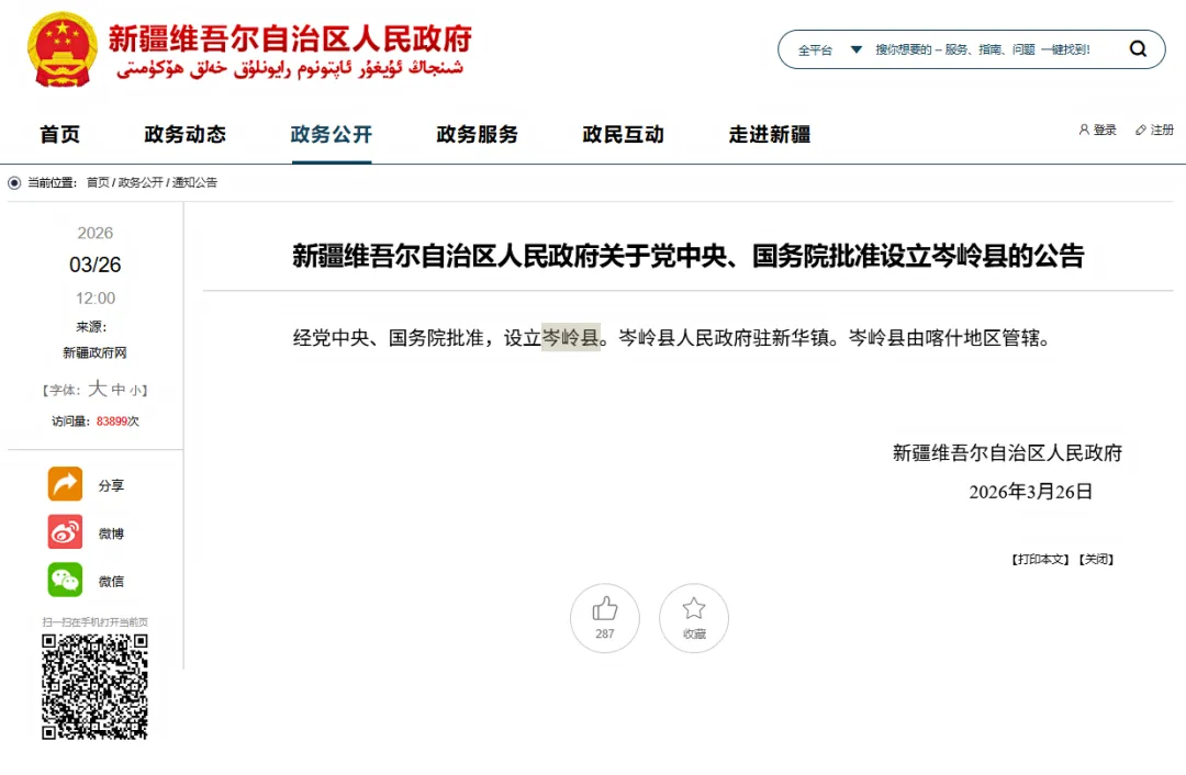 又诞生了一个新的县(图:xinjiang.gov.cn)▼