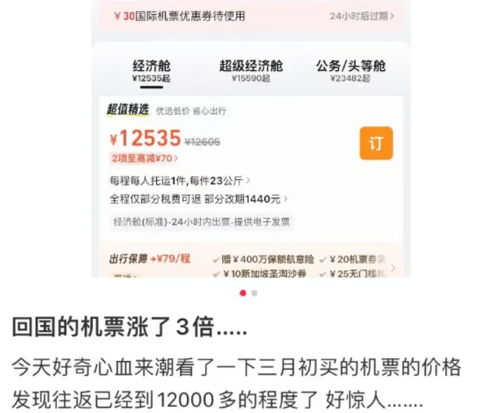 三月初买的往返机票6300人民币,现在已经接近1万;有人暑假往返机票,一个月直接翻了3倍;甚至有一家三口,前一天还是3万多,第二天就变成接近6万人民币。