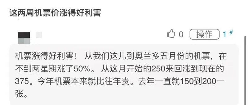 不止美国网友,德国的华人也抱怨机票从1600欧元直接涨了1000,如果从德国更贵。