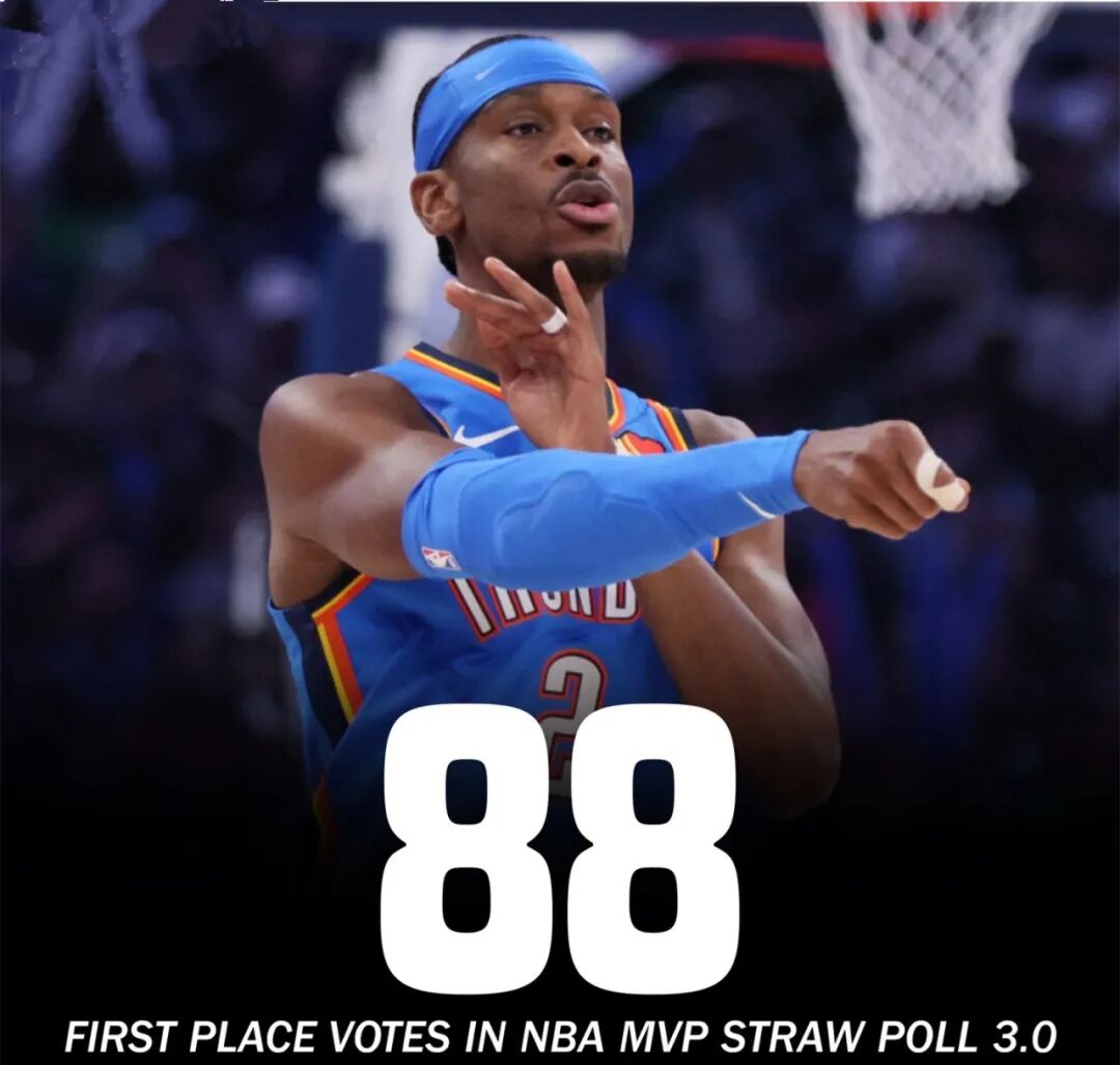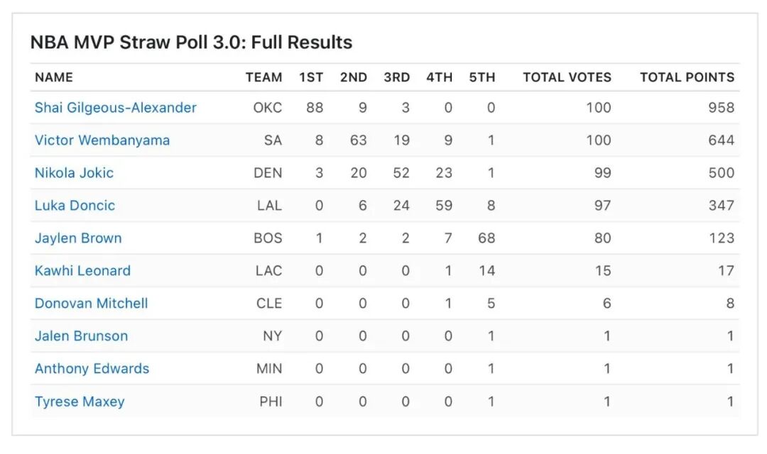 事情是这样,昨天深夜,ESPN 公布了本赛季第三次 MVP 模拟投票结果,亚历山大以 88 张第一选票、总得分 958 分断档排在第一,紧随其后的分别是文班亚马、约基奇、东契奇、杰伦布朗。