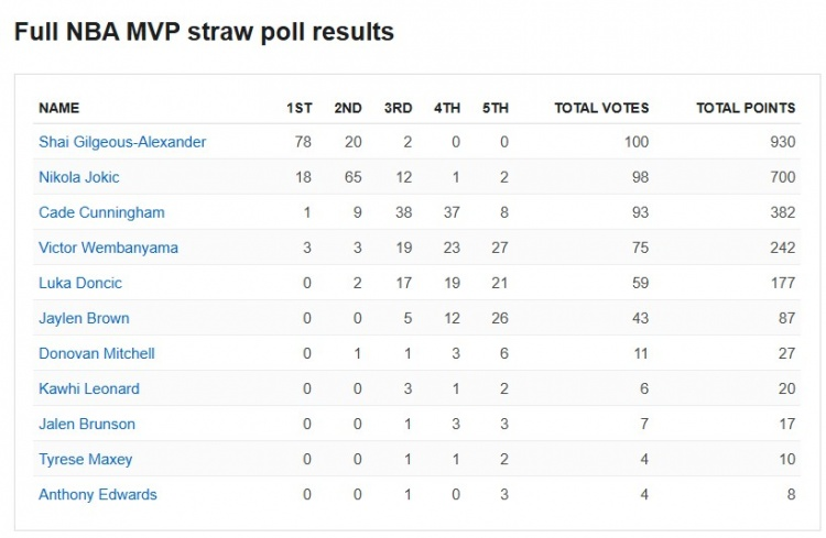 亚历山大依然排在第一,他拿走了 78 张第一选票,总得分 930 分。当时排在第二的依然是约基奇,拿走了 18 张第一选票,总得分 700 分。文班亚马已经复出,他拿到了第三多的 3 张第一选票,总得分 242 分排在第四。